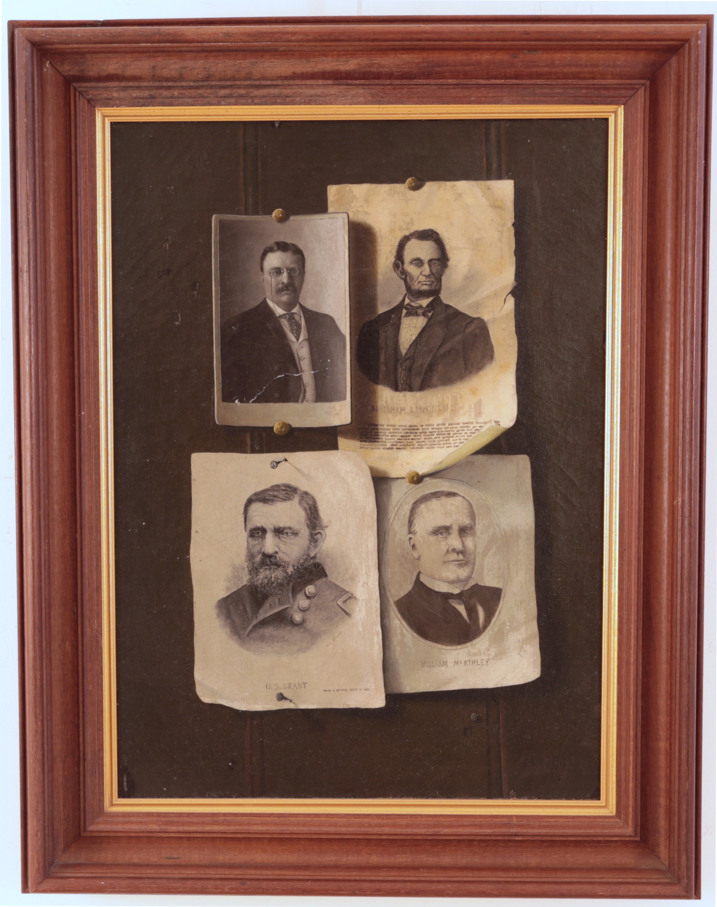 One of Griffith’s works was described by American Art Historian, William A. Gerdts, as taking “on the total iconography of Harnett, but approached it in a manner not only painterly but really romantic, with an emphasis upon irregular outlines, and dynamic compositional lines seemingly incompatible with the school." This painting, “Presidential Trompe L'oeil” surely fits that description.