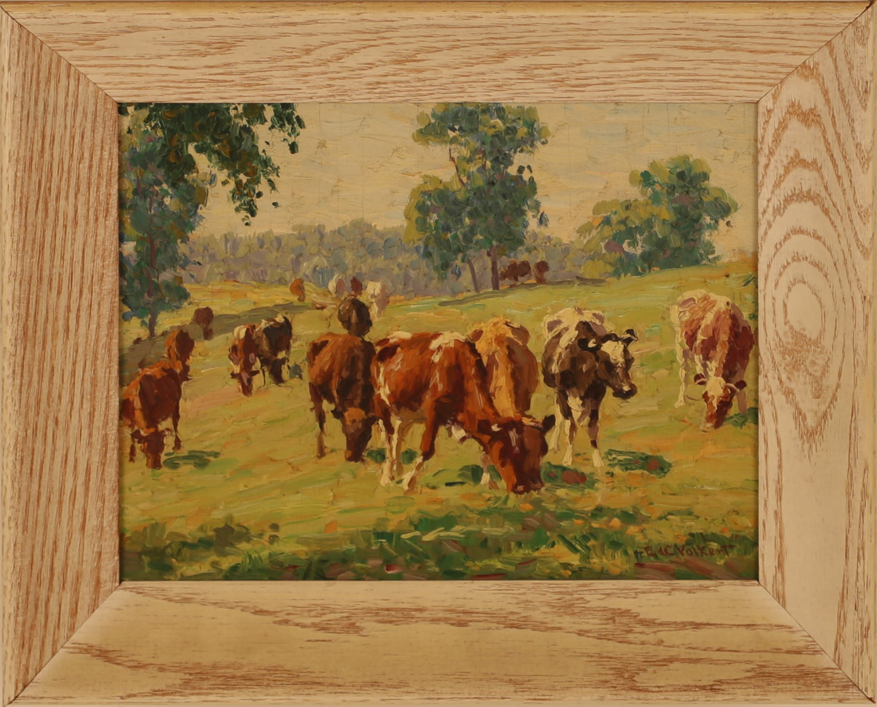 William and Susan L.Impressionist painter Edward Volkert was born was born in Cincinnati, Ohio. Volkert studied at the Art Academy of Cincinnati under Frank Duveneck and later at the Art Students League in New York City with George de Forest Brush, Henry Siddons Mowbray and plein air artist William Merritt Chase. For a time Volker lived in New York, but in 1922 he moved to Hamburg, Connecticut near Old Lyme, which had become a thriving art colony. He would visit “Miss Florence” Griswold’s boarding house in Old Lyme where the Impressionist artists congregated to socialize and discuss their art. It was among this group of artists that he fostered the notion that American artists had to find their own styles and not merely copy those of the European artists. Prior to his moving to Hamburg, Volkert had developed a fascination with painting accurate depictions of cattle and oxen, preferring the latter as the subjects of his paintings. Volkert said "Oxen are twice as good as cows at posing, because they are always ready to stand still and are not as inquisitive as cows who come over to investigate." He was to become known as "America's cattle painter." Volkert created what he called his "Cattle Logs", which were books of to scale reproductions of most of his completed paintings, so that he could recreate any painting should it be lost or destroyed. He lost his desire to paint after the death of his daughter in 1933 and he succumbed to uremic poisoning two years later. Volkert was a member of the Duveneck Society of Cincinnati (OH); president of the Bronx Art Guild and a member of the American Federation of Arts; American Watercolor Society, Painters in Watercolor; Lyme Art Association (CT); National Academy of Design (NYC); National Arts Club, (NYC); New Haven Paint & Clay Club; New York Water Color Club, Society; Salmagundi Club (NYC). Volkert exhibited at The Pennsylvania Academy of the Fine Arts (Philadelphia, PA); Panama Pacific International Exhibition (San Francisco, CA, 1915); American Watercolor Society, Painters in Watercolor; Lyme Art Association-Connecticut; National Academy of Design; Paint and Clay Club; Salmagundi Club; Art Institute of Chicago; and Corcoran Gallery, Washington D.C.