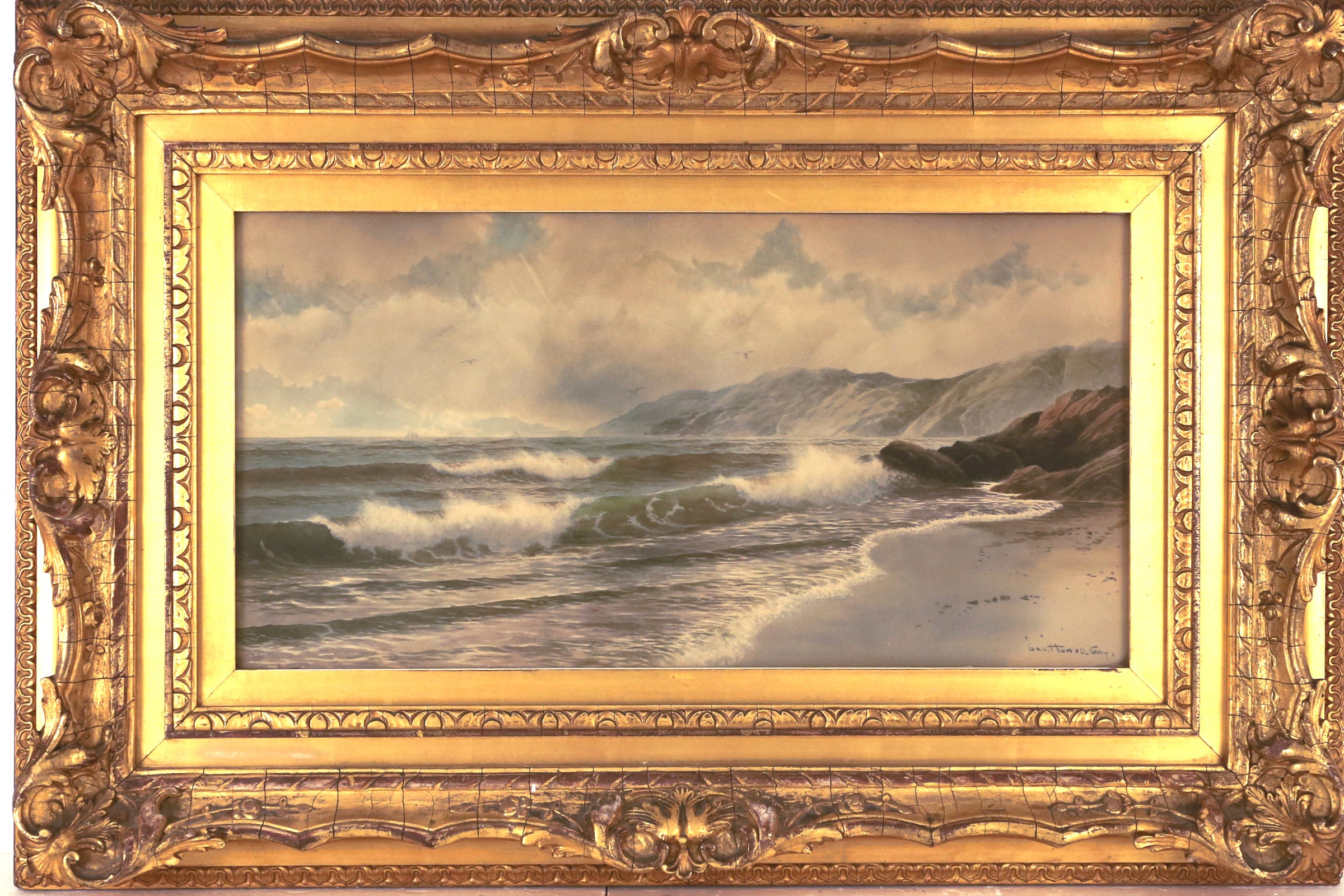 One art critic at that time, noted accurately, his inseparability of sky and sea in his marines, stating “they frown or smile, soften or battle together, -- the one – the Alter Ego – the companion spirit of the other. The swell of the sea is superb; the skies swimming in gold, crimson, rose, violet and white, or covered with scudding masses of warm, low-lying, violet-gray riven and torn to show the vivid blue above the clouds, are splendidly mirrored in tones the water’s liquid depth converts to living gems. Away off against the horizon line, he paints white sailed ships that add finely to the pictures distance.” Gay also painted scenes along the shoreline of Long Island.