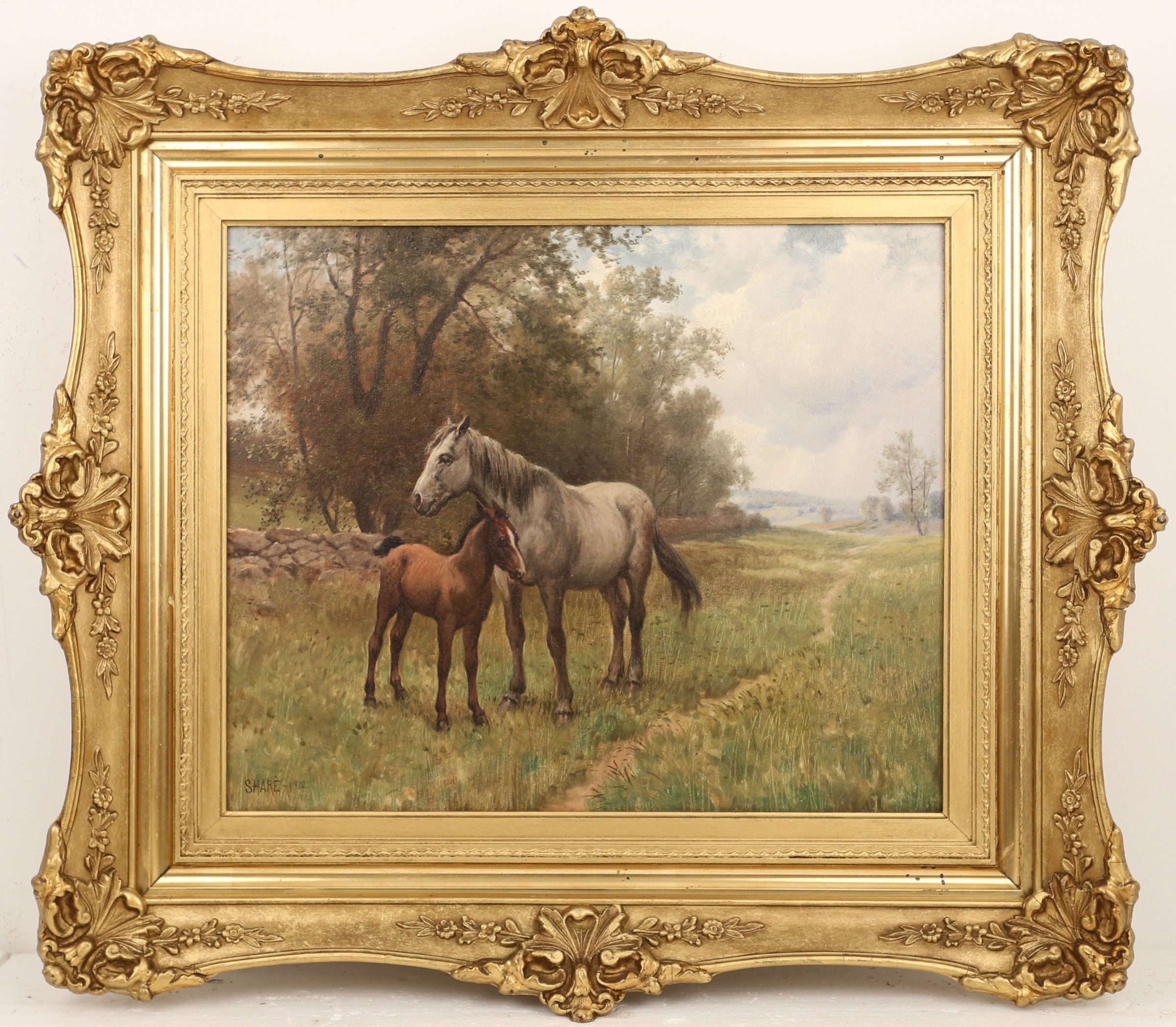 He was sought after for his illustrations by major magazines, such as Harper’s, Century, among others, and for book illustrations. He was also the art editor for New York Herald, New York World and the New York Journal. Share’s mastery of draftsmanship can be seen in this oil painting titled “Mother and Foal” – as a realistic and detailed drawing is the foundation of a masterpiece. Share was a member of the Salmagundi Club, New York Press Club, the Knickerbocker Field Club, of New York, the Union League, and the Royal Arcanum. He exhibited at the National Academy of Design (1878-85) and the Pennsylvania Academy of the Fine Arts (Philadelphia, 1880-81).
