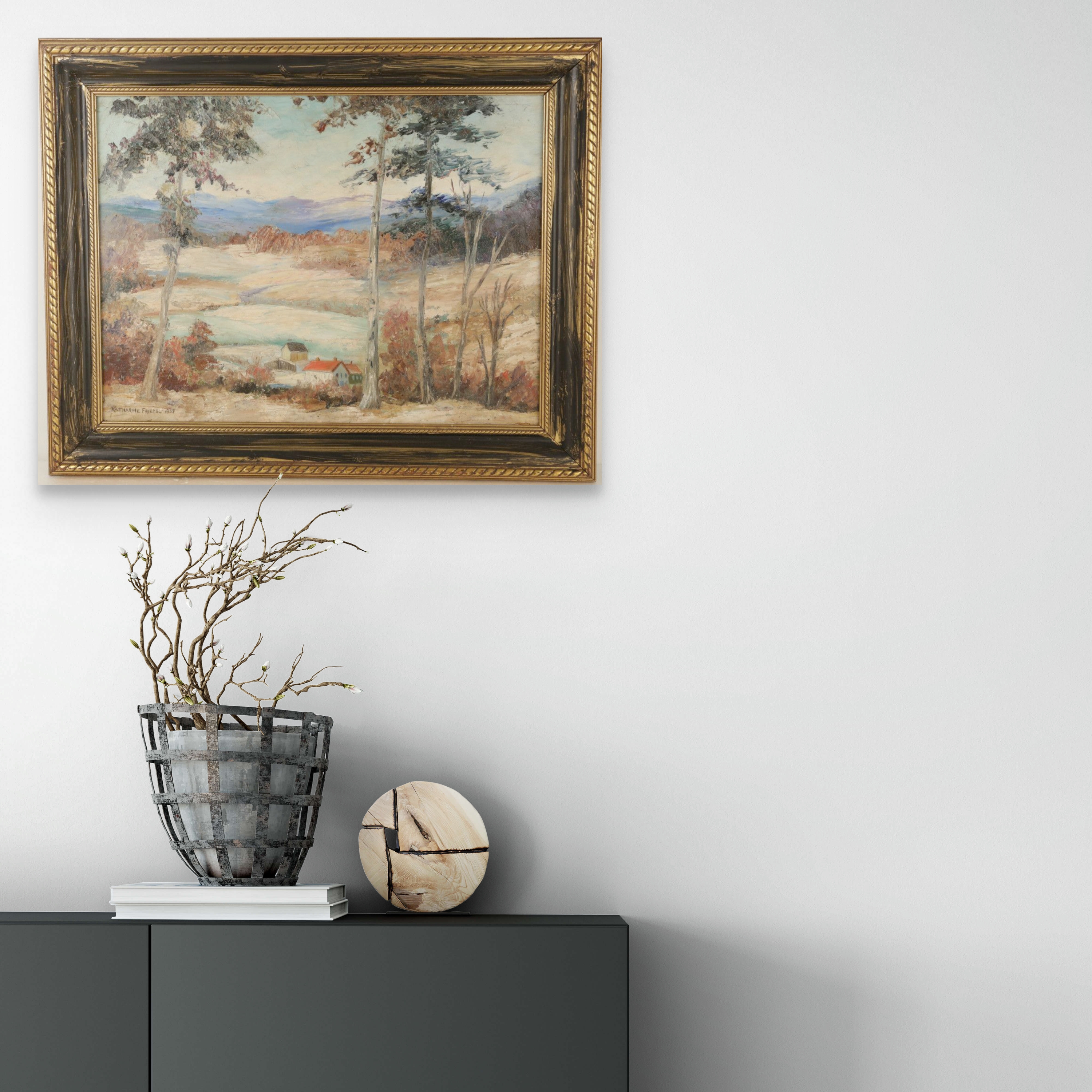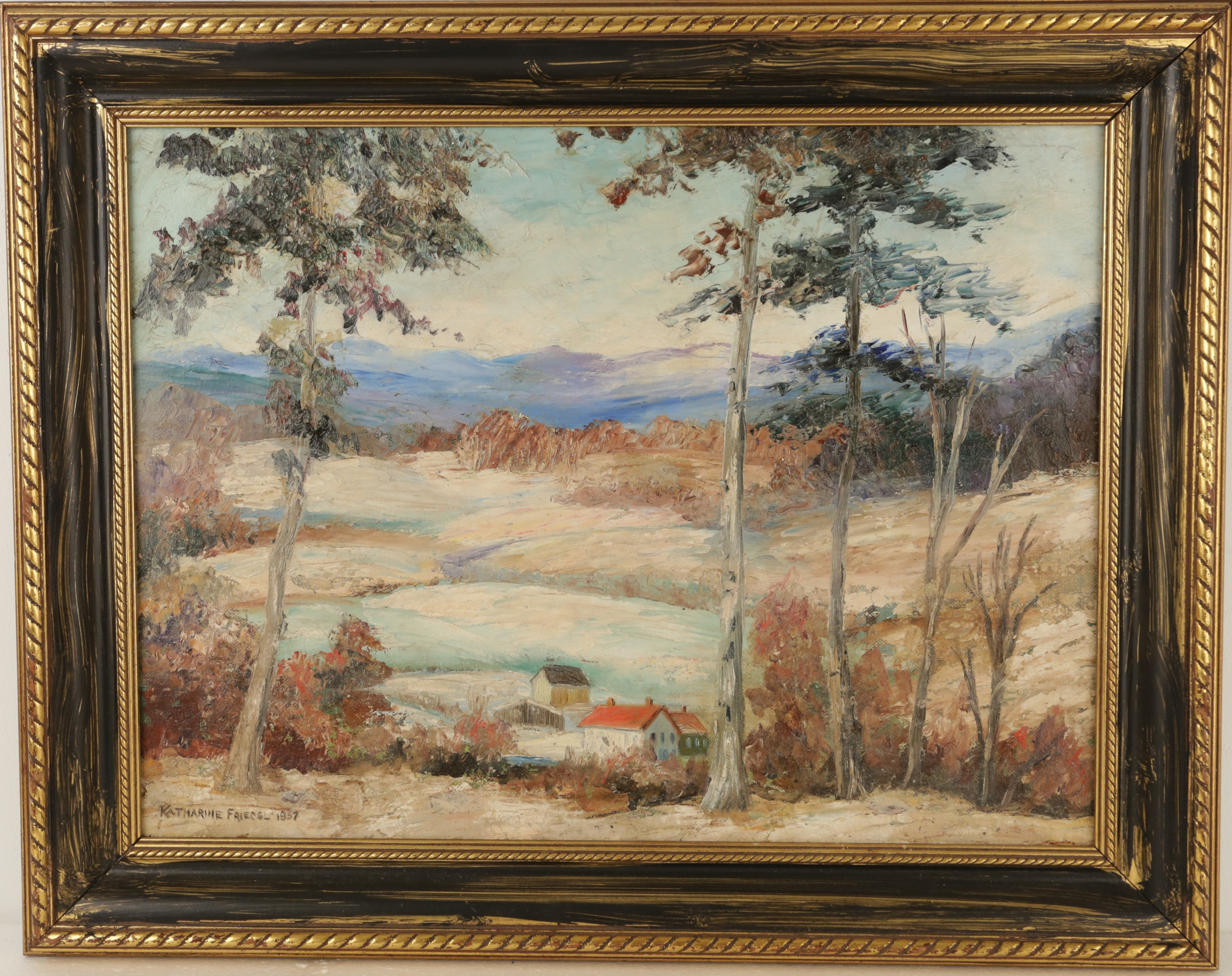 William and Susan L.Friedel was a mid-century Pennsylvania artist. We found this charming little painting by her while traveling through western New York State. It is signed Katharine Friedel 1957. The frame gives the name of a Greensburg, Pennsylvania framing shop and we were told by the seller that the painting was from an estate in Erie, Pennsylvania. It just caught our eye. We're wondering if she painted this en plein air. It is painted using a delightful color palette and impasto style that makes for a pleasing little winter scene. It’s perfect for that little niche in your home that needs brightening up.